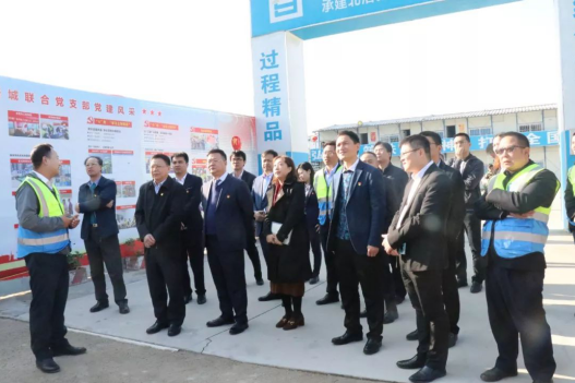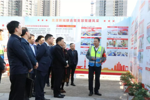 12月27日,广东省住房城乡建设厅党组书记、副厅长赵坤,房地产处处长陈必暖,质安处处长许欣毅等一行领导莅临广东腾越梧桐广场联合党支部调研指导。碧桂园集团党委委员、副总裁李静,碧桂园集团党委委员、广东腾越党委书记、总经理马小军,碧桂园集团办副主任、党群社责部总经理徐舒扬,广东腾越党委副书记、执行总经理邓培初陪同出席。