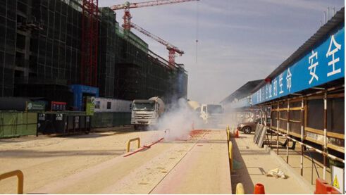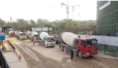 在鞭炮声中,第一罐混凝土搅拌车进场浇筑