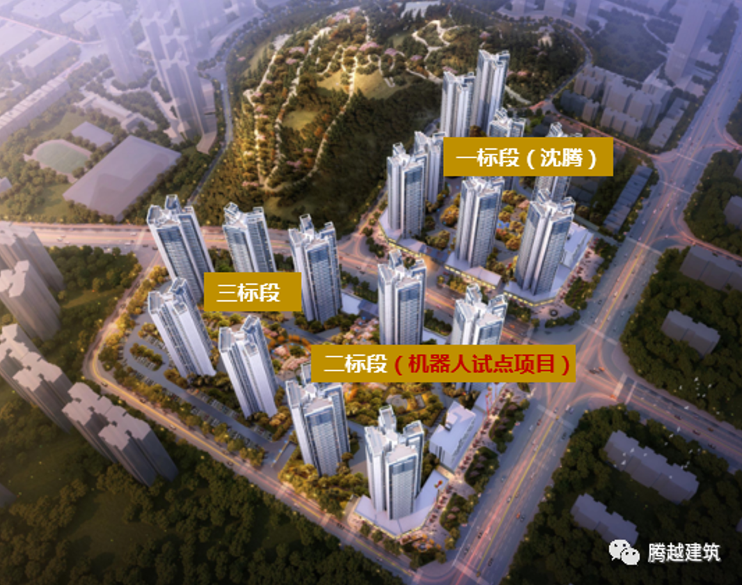 腾越建筑粤东公司惠州大陂项目位于惠州市仲恺高新区大陂村,由4栋33~34层住宅(低于百米)和1栋7层公寓及3层地下室组成,最高建筑高度98.60m,总建筑面积12.08万㎡(其中包含地下室3万㎡),为腾越建筑首批机器人应用试点项目。