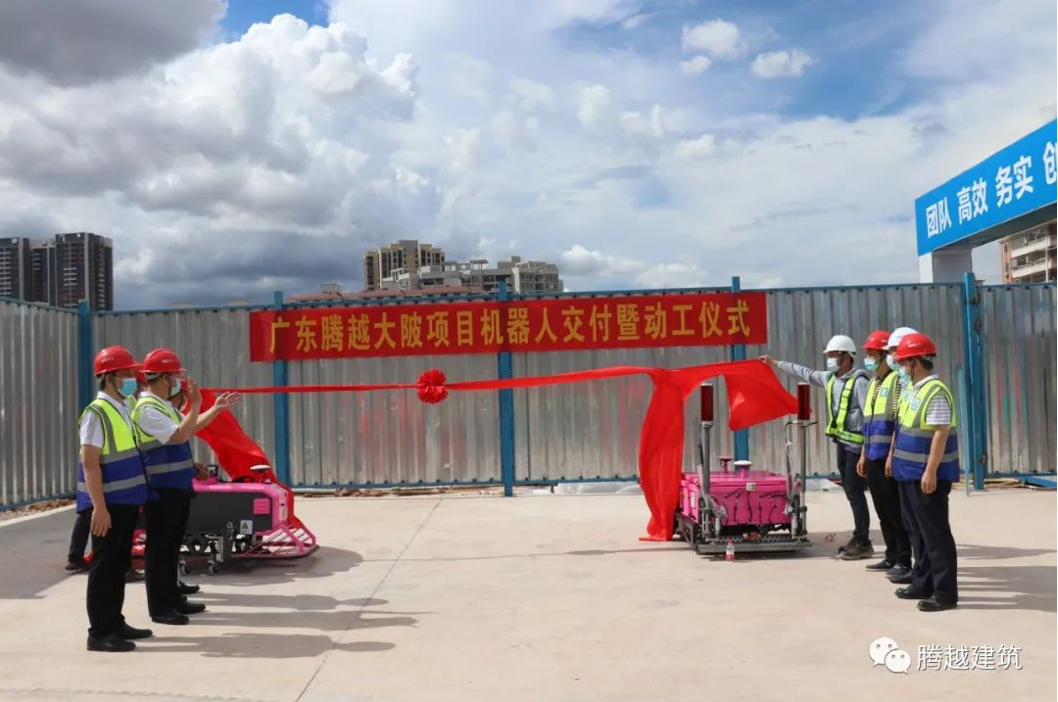 2021年6月10日,腾越建筑粤东公司惠州大陂项目机器人交付暨动工仪式在惠州大陂项目部隆重举行。博智林机器人公司向惠州大陂项目现场交付了地面整平机器人、地面抹平机器人、地面抹光机器人3款共6台建筑机器人。
