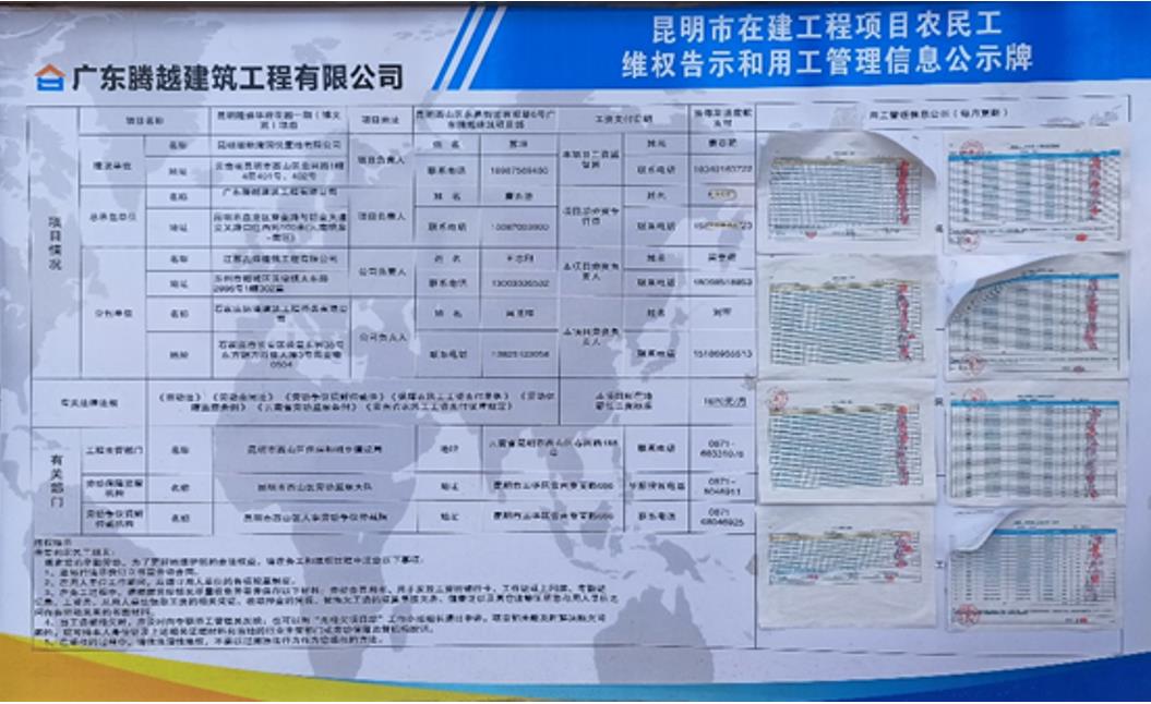 严控工资关——项目通过办理农民工工资专户,缴纳农民工工资保证金,确保工资足额发放。每月按时提交劳务人员工资代付申请,通过农民工工资专户发放薪资,每月核发的工资必须经过本人签字确认并张榜公示,确保工资按时发放。同时,各项目大门口还设置农民工维权告示牌,建立绿色申诉通道,让工人不再忧“薪”。