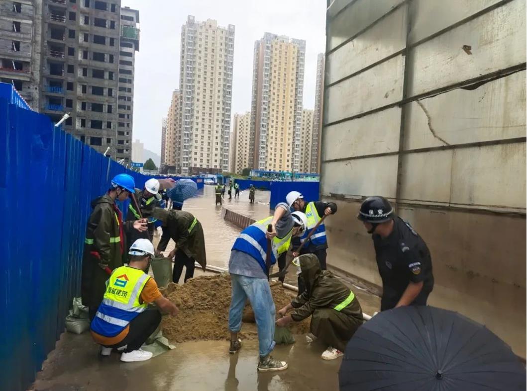 在雨中,装沙袋防汛,防止洪水进一步蔓延