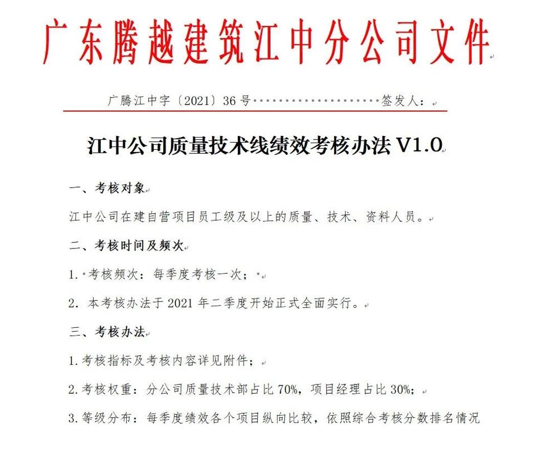 在现场管理方面,江中公司严格执行集团和公司相关质量管控文件,并在内部推行全员责任考核,与栋号长和劳务班组签订责任状,形成劳务先行、栋号长全责铺垫,项目经理统筹运作,区域领导班子高端对接的“线条式问责”垂直管理机制。
