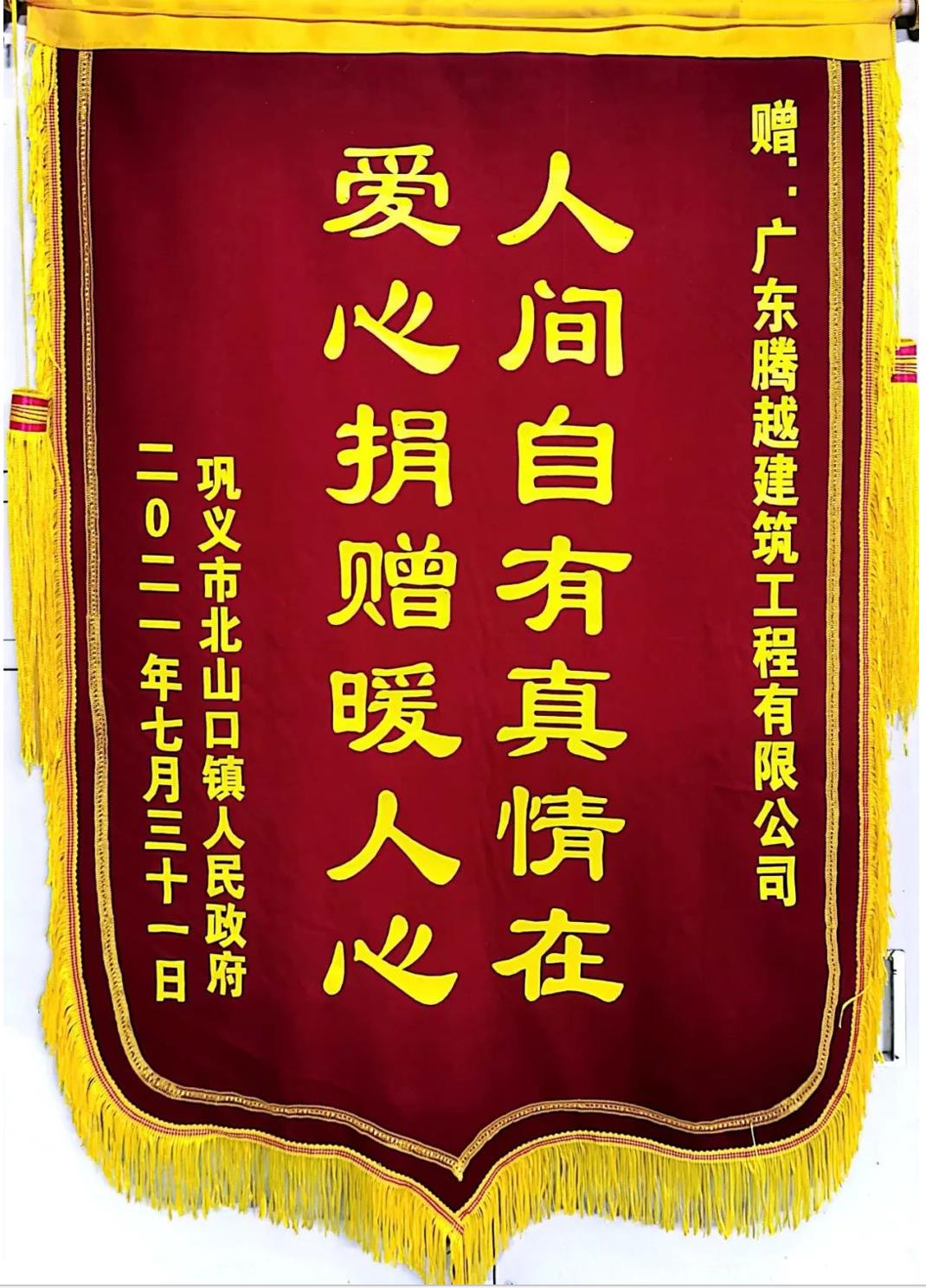 而这份爱也获得了河南省当地政府的肯定与感谢,河南省巩义市北山口镇人民政府为腾越建筑河南公司金科天宸项目颁发表彰锦旗,感谢腾越建筑对巩义市受灾村镇的无私支持。