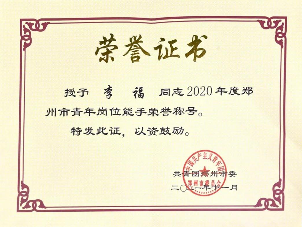 也被评为“2020年度郑州市青年岗位能手”荣誉称号